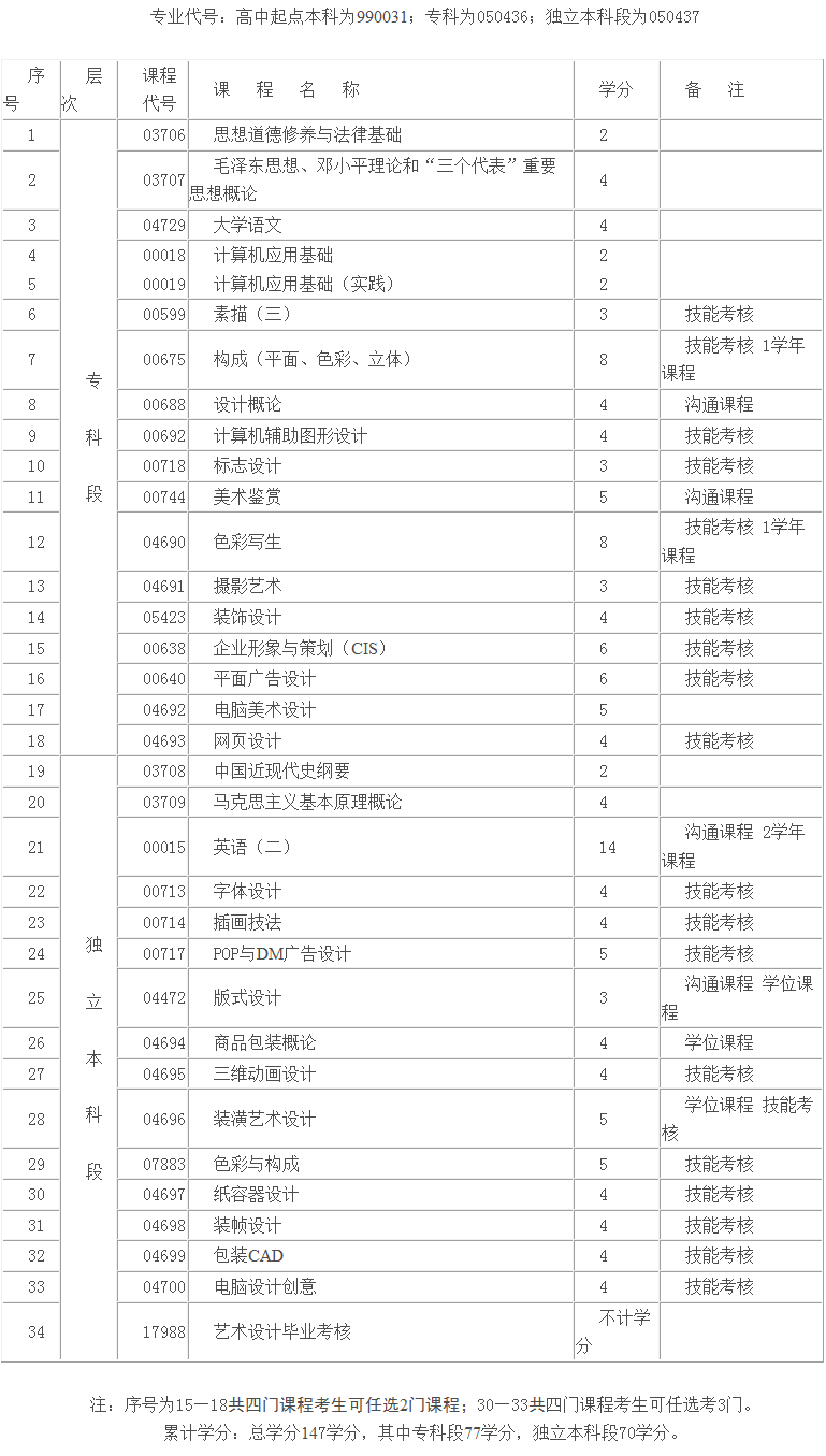 核心课程:计算机辅助图形设计、标志设计、色彩写生、摄影艺术、装饰设计、企业形象与策划、平面广告设计、电脑美术设计、网页设计、字体设计、插画技法、POP与DM广告设计、板式设计、三维动画设计、装潢艺术设计、色彩与构成、纸容器设计、装帧设计、电脑设计创意等。